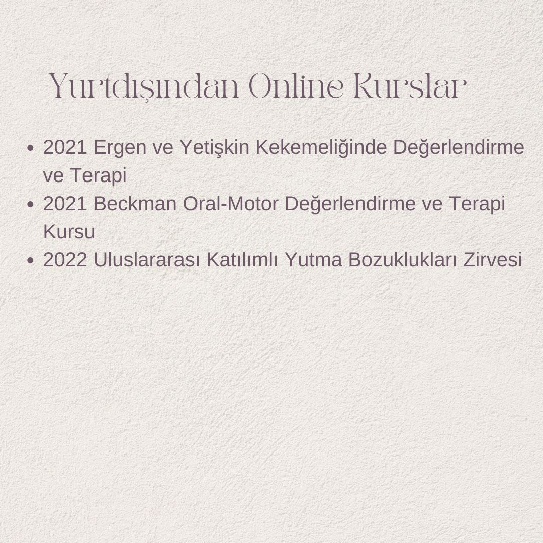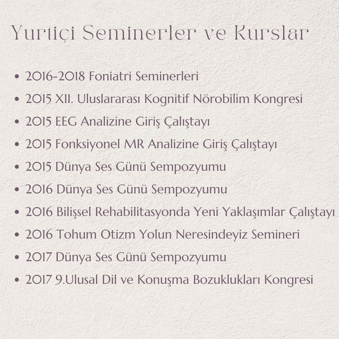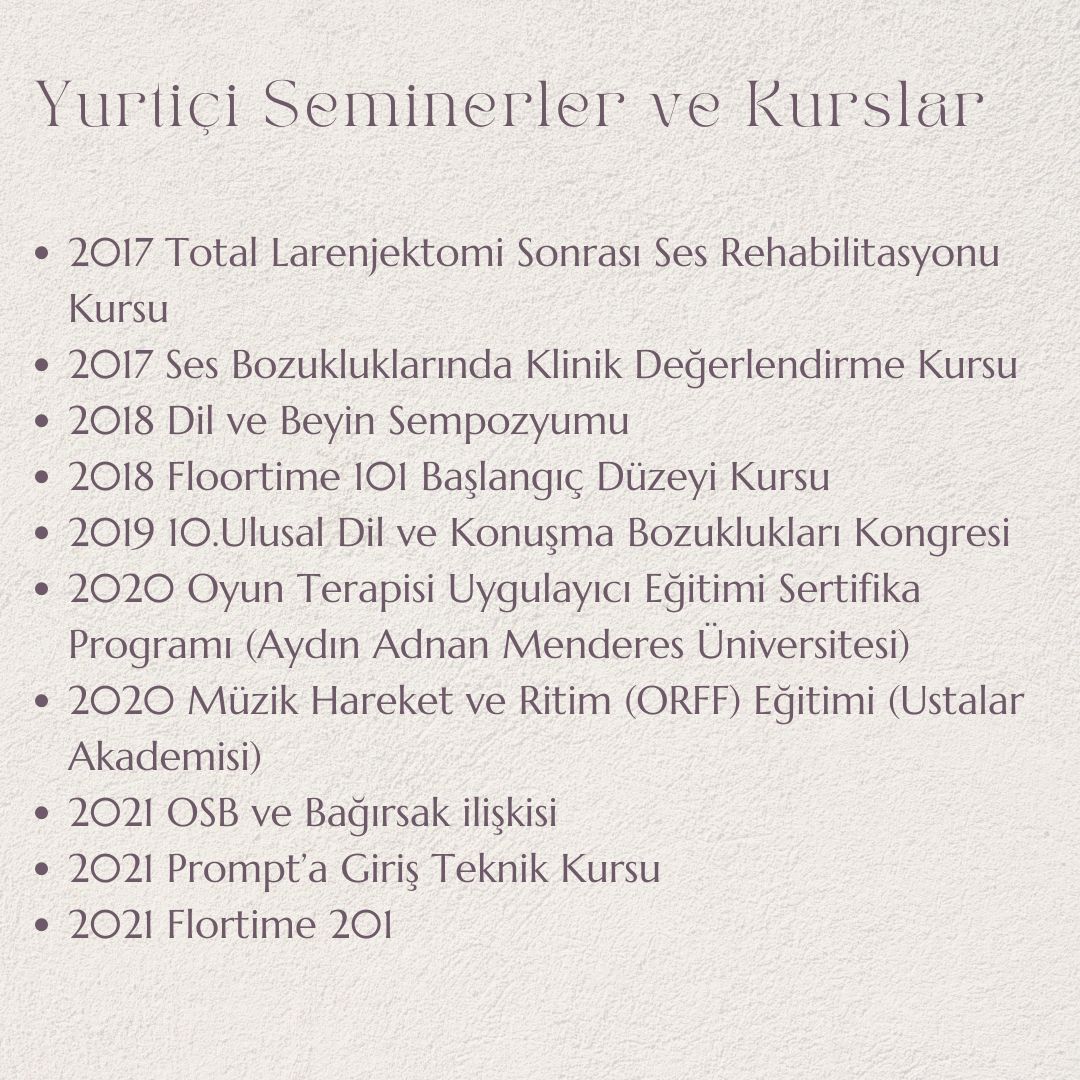 2024 yılında ise İstinye Üniversitesi Dil ve Konuşma terapisi yüksek lisans programını tamamlayarak uzman ünvanı almıştır.