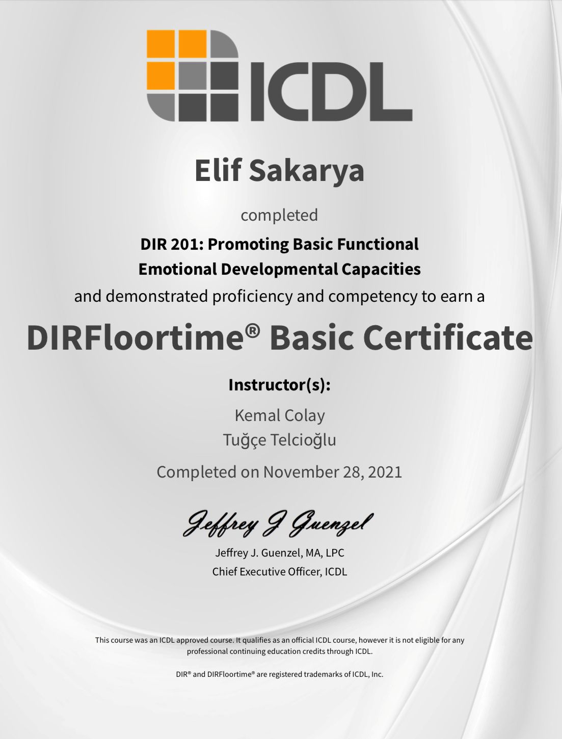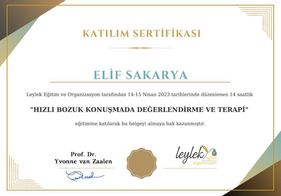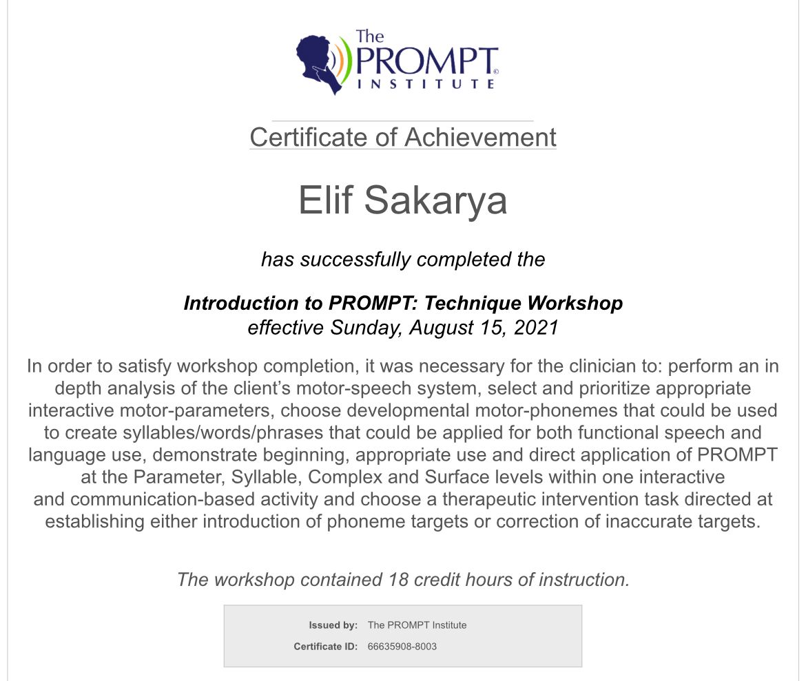 Uzm. DKT Elif Sakarya aynı zamanda Floortime 201 terapisti ve Prompt klinisyenidir. Beckman Oral Motor Therapy, Palin PCI kekemelik terapisi ve oyun terapisi uygulayıcısıdır.